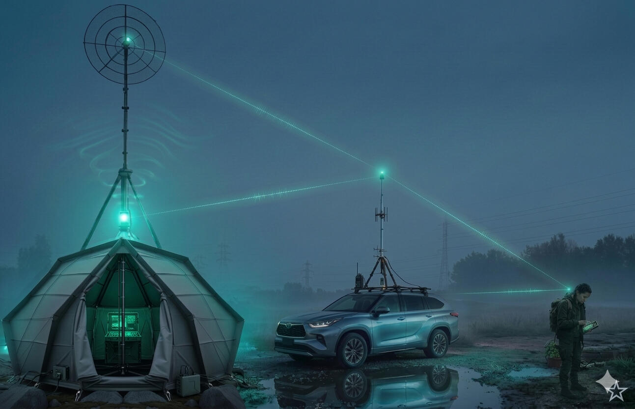 CODA expands beyond handheld range by integrating elevated and mobile nodes into the network.A tripod-mounted antenna at approximately 20 feet establishes a high-point base, increasing line-of-sight and overall coverage. A vehicle-mounted unit with a 10-foot antenna extends the network dynamically across terrain, while handheld devices maintain direct communication at the user level.Together, these three elements form a resilient, high-performance communication triangle that significantly increases range while remaining fully independent of infrastructure.